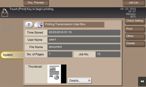The fax documents required for polling are stored in the Polling Transmission User Box. Once you have opened the User Box, you can select a fax document stored in the User Box and preview, print out, or delete it.