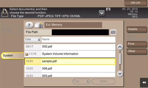Once you have opened the User Box, you can print out a file stored on a USB memory. Also, you can read the original data and directly save it as a file in the USB memory. You can also move a file from the USB memory to the External Memory User Box.