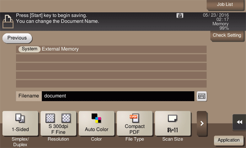 You can set a file name and the storage options when saving the scanned data of an original on an external memory.