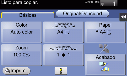 [Copiar] | Toque este botón para visualizar la pantalla principal del modo Copia. Para obtener más información, consulte Aquí. |