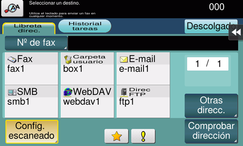 [Esc./Fax] | Toque este botón para visualizar la pantalla principal del modo Escáner/Fax. Para obtener más información, consulte Aquí. |