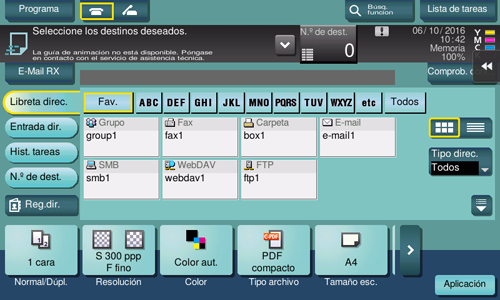 Si es necesario, puede cambiar la visualización de la pantalla principal en el modo fax/escáner (opción predeterminada: [Libreta direc.]). Para obtener más información, consulte Aquí.
