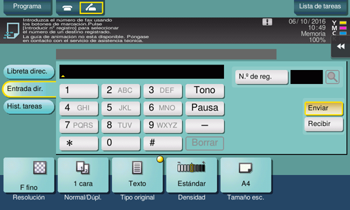 Los números de fax pueden especificarse en [Libreta direc.], [Entrada dir.], [Hist. tareas] o [Programa]. Para obtener más información sobre cómo especificar un destino, consulte Aquí. Para obtener más información sobre cómo especificar un programa de fax/escaneado, consulte Aquí.