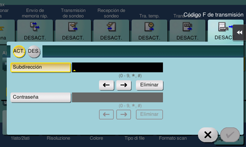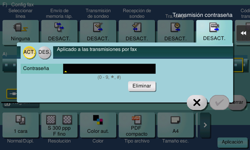 Toque [Aplicación] - [Ajustes fax] - [Transmisión contraseña] y, a continuación, toque [ACT.]