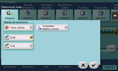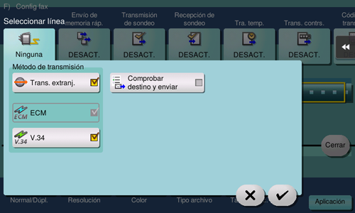 Transmisión de temp., Distribución de relevo, Comunicación confidencial, ECM desactivado, V.34 desactivado, Trans. memoria rápida, Trans. extranj., Transmisión contraseña, Trans sondeo (Boletín), Recep sondeo (Boletín).