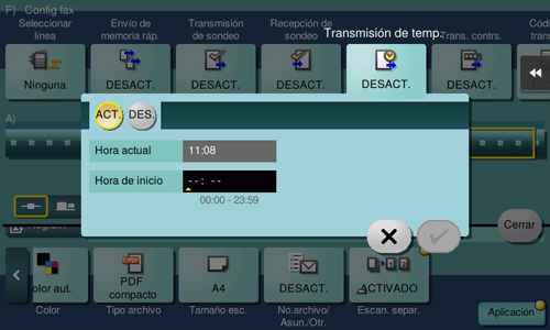 Toque [Aplicación] - [Ajustes de fax] - [Trans temporiz] y, a continuación, toque [ACT.]