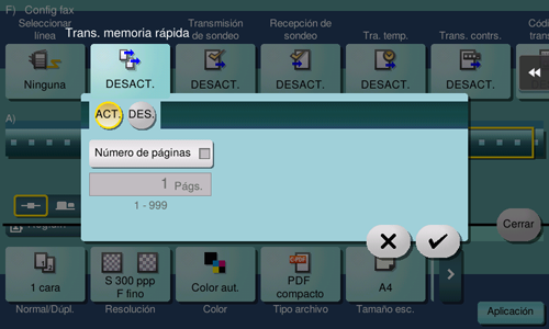 Toque [Aplicación] - [Config fax] - [Trans. memoria rápida] y, a continuación, toque [Act.]