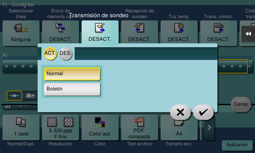 Transmisión de temp., Distribución de relevo, Comunicación confidencial, ECM desactivado, V.34 desactivado, Trans. memoria rápida, Trans. extranj., Transmisión contraseña, Trans sondeo, Recep sondeo, Recep sondeo (Boletín).