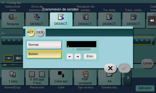 Transmisión de temporizador, Transmisión de sondeo, Transmisión de sondeo (Boletín), Recepción de sondeo, Recepción de sondeo (Boletín), transmisión de difusión incluyendo otros destinos que no son de fax