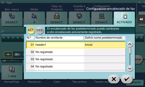Los cambios en la [Config. encabez. de fax] solo son temporales. Es útil especificar nombres de remitente frecuentes como valores predeterminados cuando se registran nombres de remitente.