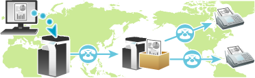 Si ha agrupado las estaciones de repetición y los destinatarios por área, puede reducir los costes de comunicación totales de la difusión de fax a todos los destinos. Esto es útil para la difusión a ubicaciones lejanas.
