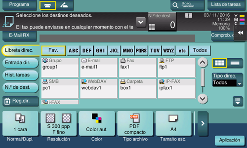 Si es necesario, puede cambiar la visualización de la pantalla principal en el modo fax/escáner (opción predeterminada: [Libreta direc.]). Para obtener más información, consulte Aquí.