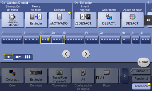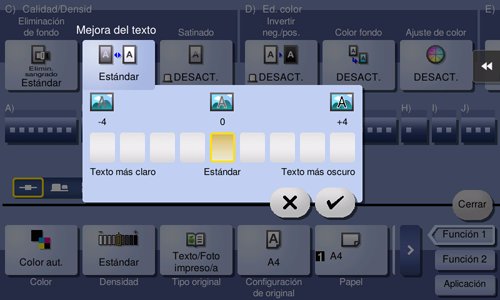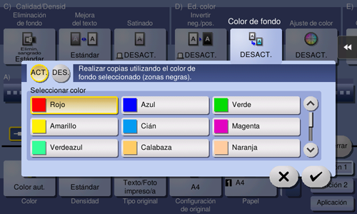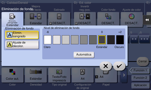 [Nivel de eliminación de fondo] | Toque este botón para ajustar la densidad del color de fondo para un original con un fondo en color. Si se selecciona la opción [Automática], la densidad del color de fondo se determina de forma automática y el original se copia con una densidad del fondo óptima. |