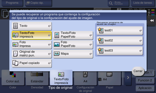 [Recuperar programa de ajuste de imagen] | LLame el programa de ajuste de la calidad de imagen. Se aplica el contenido registrado de un programa. Para un programa de ajuste de imagen, puede registrar la configuración de [Tipo de original], [Densidad], [Eliminación de fondo], [Mejora del texto], [Invertir neg./pos.], [Color de fondo], [Ajuste de colores], and [Imagen reflejada]. Para obtener más información sobre cómo se registra, consulte Aquí. |