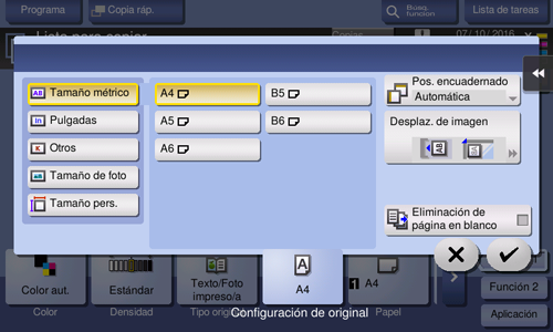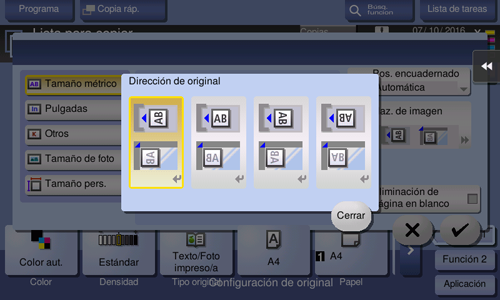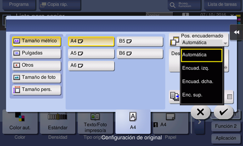 [Automática] | Establece automáticamente la posición de encuadernación del original. Si el lado largo del original mide 11-11/16 pulgadas (297 mm) o menos, la posición de encuadernado se ajusta en el lado largo del papel. Si el lado largo del original supera las 11-11/16 pulgadas (297 mm), la posición de encuadernado se ajusta en el lado corto del papel. |