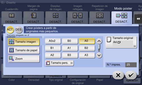 [ACT.]/[DES.] | Seleccione [ACT.] para especificar Modo póster. |
