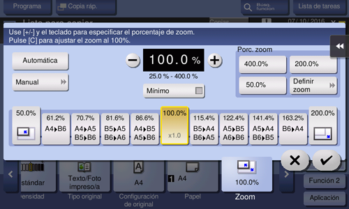 Zoom fijo | Seleccione una escala predeterminada para copiar originales de un tamaño estándar a un tamaño de papel también estándar. La bandeja de papel se selecciona automáticamente en función del porcentaje de escala elegido. |
