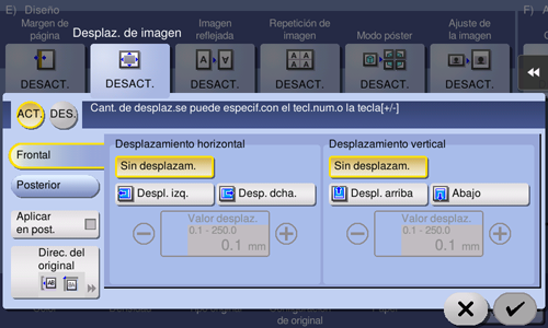 [Lado frontal]/[Lado posterior] | Ajuste la posición de la imagen en el papel de impresión, desplazando la imagen del original en dirección horizontal o vertical.