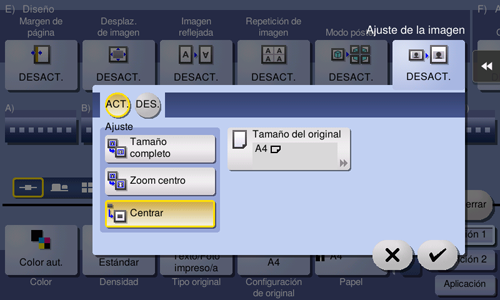 Especifique cómo se debe disponer la imagen del original sobre el papel. Puede ampliar una parte del original hasta los límites máximos del papel o acomodar la imagen original en el centro de la página sin ampliarla.