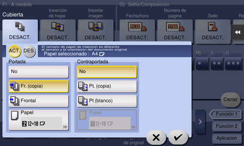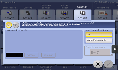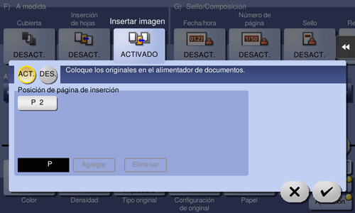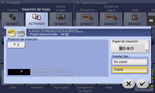 [ACT.]/[DES.] | Seleccione [Act.] para especificar la opción Inserción de hojas. |