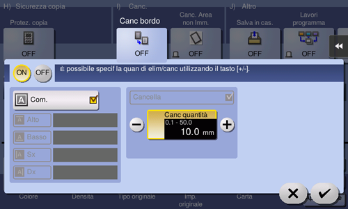 [Marco] | Seleccione esta opción para borrar los cuatro lados del original al mismo ancho. En [Borrar cantidad], toque [+]/[-] para el área de pulgadas, toque [+]/[-] o el teclado para el área de centímetros para especificar el ancho del área que se debe borrar. Para mostrar el teclado, toque el área de entrada numérica. |