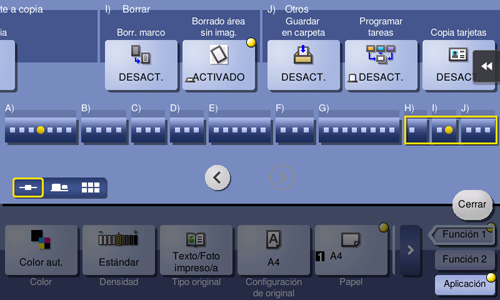 [Arriba]/[Abajo]/[Izq.]/[Derecha] | Seleccione esta opción para borrar los cuatro lados del original a diferentes anchos. Borre el [Marco], seleccione un lado ([Super.], [Inferior], [Izq.] o [Dcha.]) y especifique el ancho del área tocando [+]/[-] para un área en pulgadas o tocando [+]/[-] o el teclado para un área en centímetros. Para mostrar el teclado, toque el área de entrada numérica. Si no desea borrar el lado, cancele la configuración de [Borrar]. |