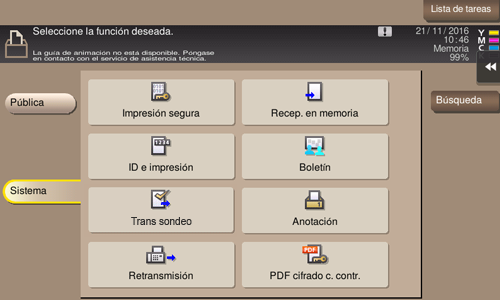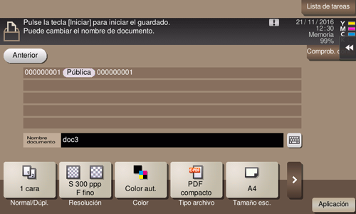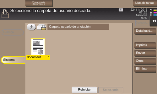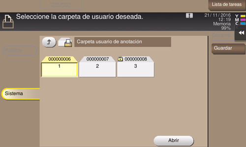 Toque [Utilidad] - [Configuración administrador] - [Registro de carpeta de usuario/solo un toque] - [Registro carpeta] - [Carpeta usuario de anotación] - [Nueva].