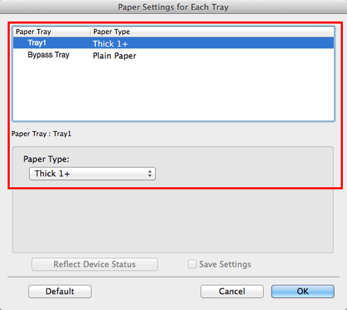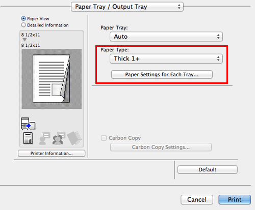 En [Paper Settings for Each Tray...], puede definir un tipo de papel para cada bandeja. Al especificar una función distinta de [Auto] en [Paper Tray:], la información del tipo de papel se especifica aquí.