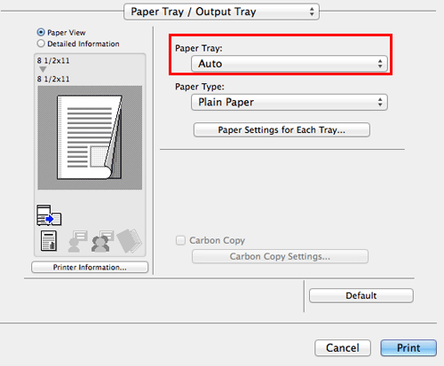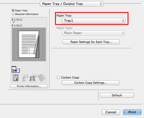 En [Paper Tray:] de [Paper Tray / Output Tray], seleccione la bandeja de papel que debe utilizarse para la impresión.