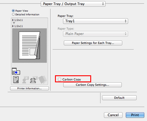 [Carbon Copy Tray] | Seleccione la bandeja de papel para los duplicados. Seleccione las casillas de verificación de todas las bandejas de papel que se van a utilizar. |