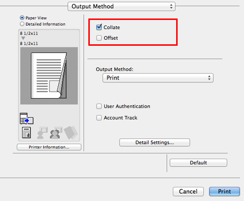 Cuando está seleccionada la casilla de verificación [Collate] en [Output Method], las copias se imprimen juego por juego; por ejemplo: "Pages 1, 2, 3, 4, and 5", "Pages 1, 2, 3, 4, and 5" y, a continuación, "Pages 1, 2, 3, 4, and 5".