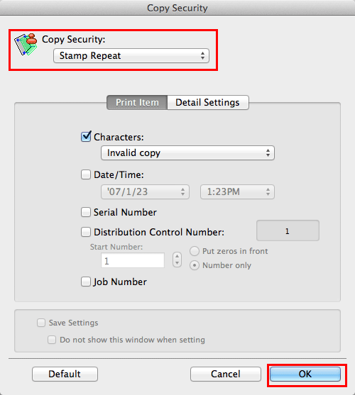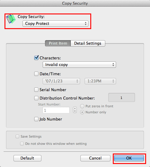 En [Stamp / Composition], seleccione la casilla de verificación [Copy Security] y, a continuación, haga clic en [Settings...]