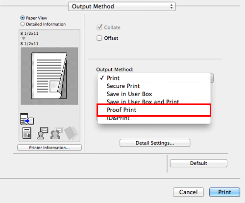 En [Output Method:], en la ventana [Output Method], seleccione [Proof Print].