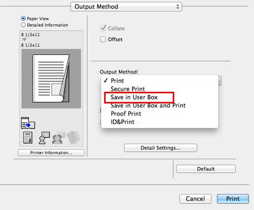 En [Output Method:], en la ventana [Output Method], seleccione [Save in User Box].