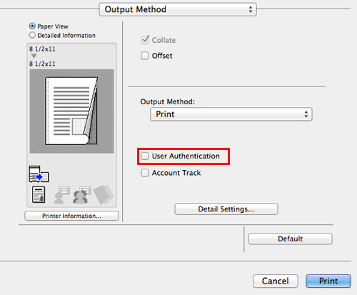 Si se selecciona [Print] en [Output Method:] con la casilla de verificación [User Authentication]/[Account Track] desactivada en la ventana [Output Method] del controlador de impresora, el trabajo de impresión se considera un trabajo sin información de autenticación.
