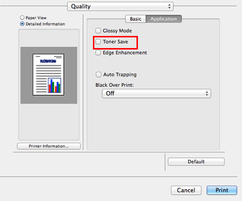 Al seleccionar la casilla de verificación [Toner Save] en [Quality], se ajusta la densidad de impresión para reducir el consumo de tóner.