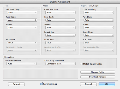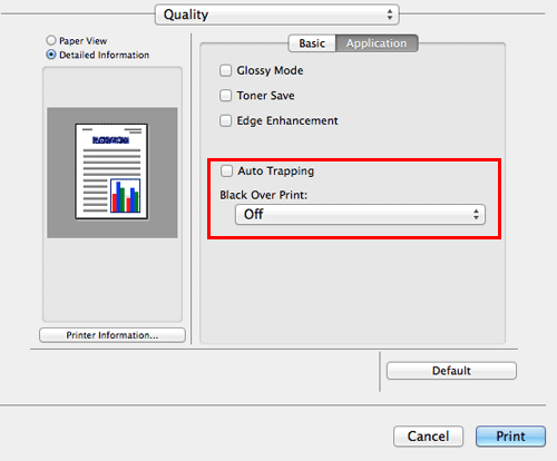En [Quality], seleccione la casilla de verificación [Auto Trapping] o configure el ajuste [Black Over Print:].