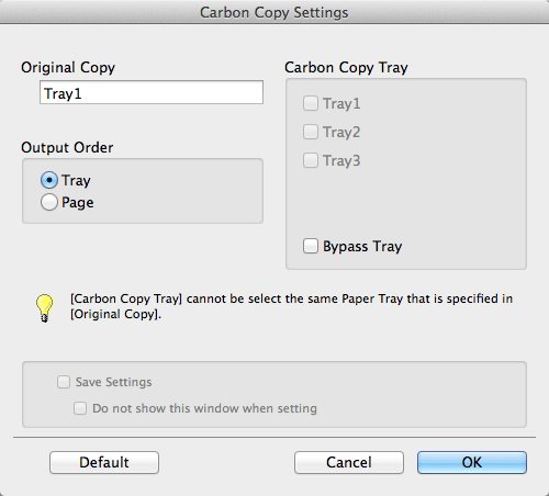 [Save Settings] | Si se selecciona la casilla de verificación Save Settings, los ajustes se guardan. Si se selecciona la casilla de verificación [Do not show this window when setting] este cuadro de diálogo no aparecerá la próxima vez cuando la opción [Carbon Copy] está activada. Con esta función, puede omitir algunos pasos en las opciones de configuración la próxima vez y posteriormente si siempre especifica la misma configuración de bandeja de documento duplicado para ejecutar un trabajo de impresión. |