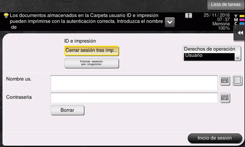 Si selecciona [Iniciar sesión tras imprimir] en [ID e impresión ], iniciará sesión en esta máquina después de imprimir datos. Cambie el ajuste para visualizar [Iniciar sesión tras imprimir]. Para obtener más información, consulte Aquí.