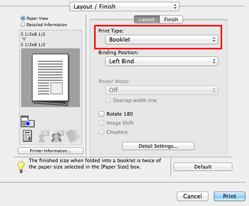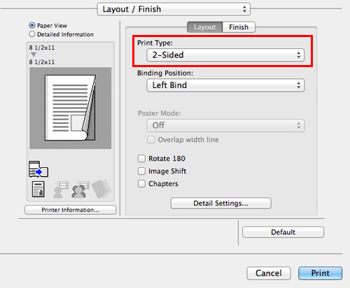 En [Print Type:], en [Layout / Finish], seleccione [2-Sided]. [2-Sided] es la opción predeterminada.