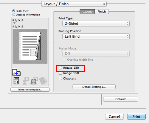 En [Layout / Finish], seleccione la casilla de verificación [Rotate 180].