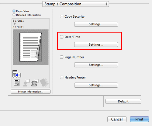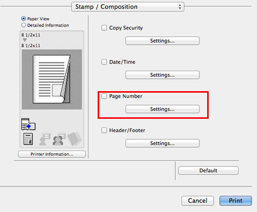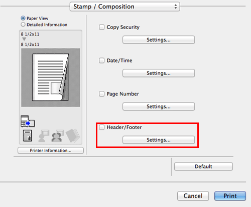 En [Stamp / Composition], seleccione la casilla de verificación [Header/Footer] y, a continuación, haga clic en [Settings...]