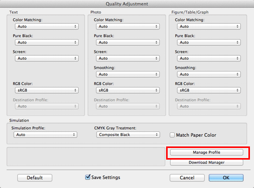 Especifique la configuración de [RGB Color:], [Destination Profile:] y [Simulation Profile:].