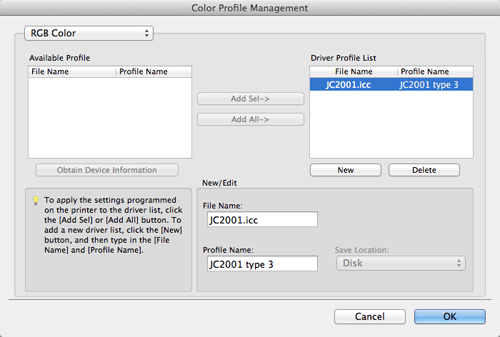 Para utilizar los nuevos perfiles ICC registrados en esta máquina, debe agregar previamente los perfiles ICC al controlador de impresora. Para obtener más información, consulte Aquí.