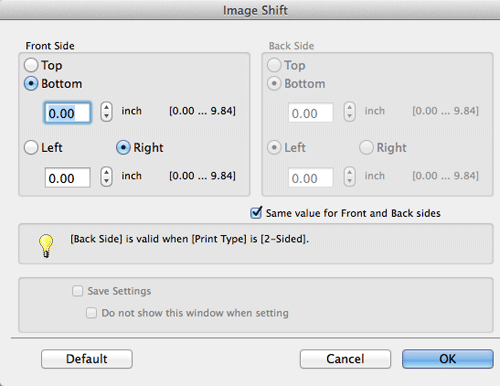 Al imprimir imágenes en ambas caras, al seleccionar la casilla de verificación [Same value for Front and Back sides], se aplican los mismos ajustes en ambas caras.