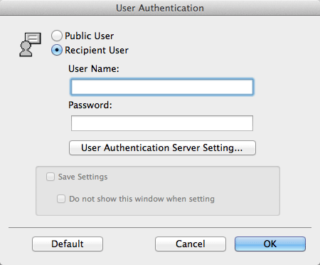 Con la autenticación de usuario activada, seleccione [Recipient User], introduzca el nombre de usuario y la contraseña y, a continuación, haga clic en [OK].