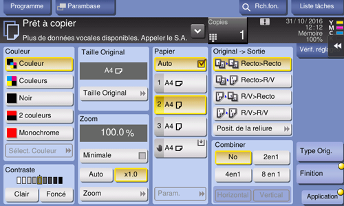 Vous pouvez configurer une touche dans laquelle est mémorisée une combinaison de réglages de finition (programme Finition) sur l'écran principal du mode Copie. Si vous disposez la combinaison de paramètres de finition fréquemment utilisés sous une touche de rappel sur l'écran principal, il peut être utile de spécifier ces paramètres en actionnant une seule touche.
