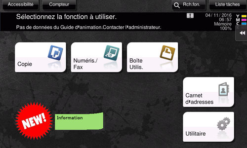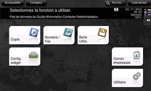Vous pouvez disposer des textes, icônes, GIF animés ou autres éléments en tant que widgets à l'endroit souhaité du menu principal ou de l'écran Mode Copie. La disposition de widgets sur les écrans fréquemment utilisés permet de mettre en valeur les informations importantes.
