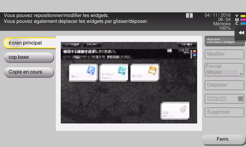 Sélectionnez l'écran où disposer un widget de [Écran principal], [cop. base] ou [Copie en cours].