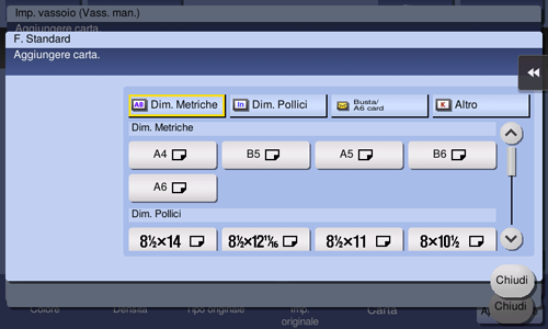 [Metr. Formate] | Quando si carica carta di dimensione metriche nel Vassoio bypass, selezionare il formato carta. |